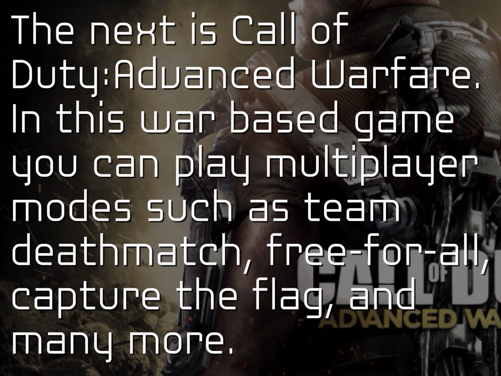 The next is Call of Duty:Advanced Warfare. In this war based game you can play multiplayer modes such as team deathmatch, free-for-all, capture the flag, and many more.