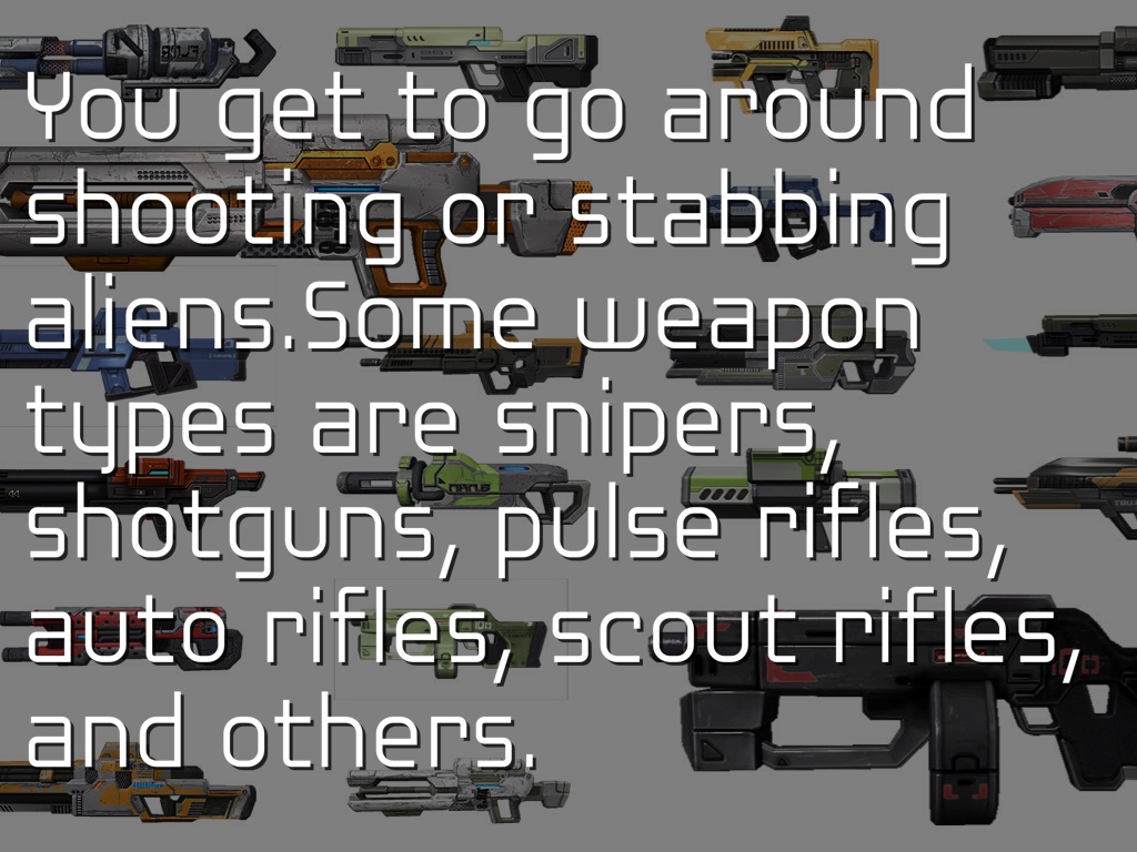 You get to go around shooting or stabbing aliens.Some weapon types are snipers, shotguns, pulse rifles, auto rifles, scout rifles, and others.