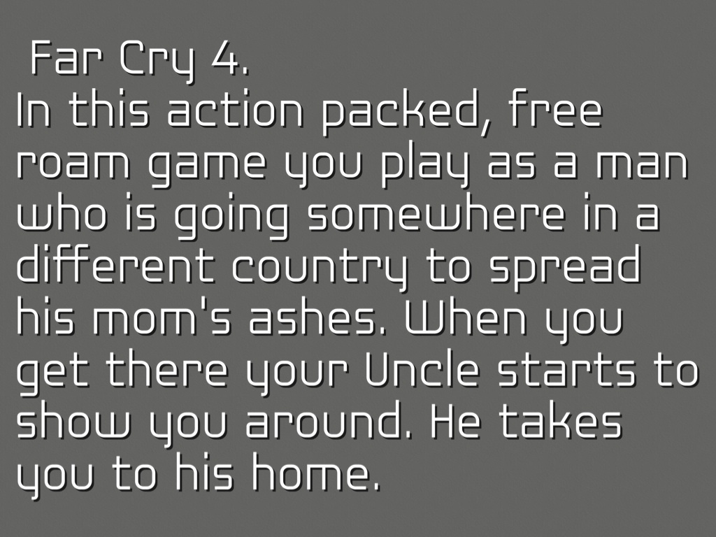 In this action packed, free roam game you play as a man who is going somewhere in a different country to spread his mom's ashes. When you get there your Uncle starts to show you around. He takes you to his home.