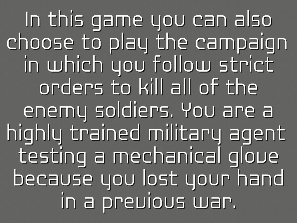 In this game you can also choose to play the campaign in which you follow strict orders to kill all of the enemy soldiers. You are a highly trained military agent testing a mechanical glove because you lost your hand in a previous war.