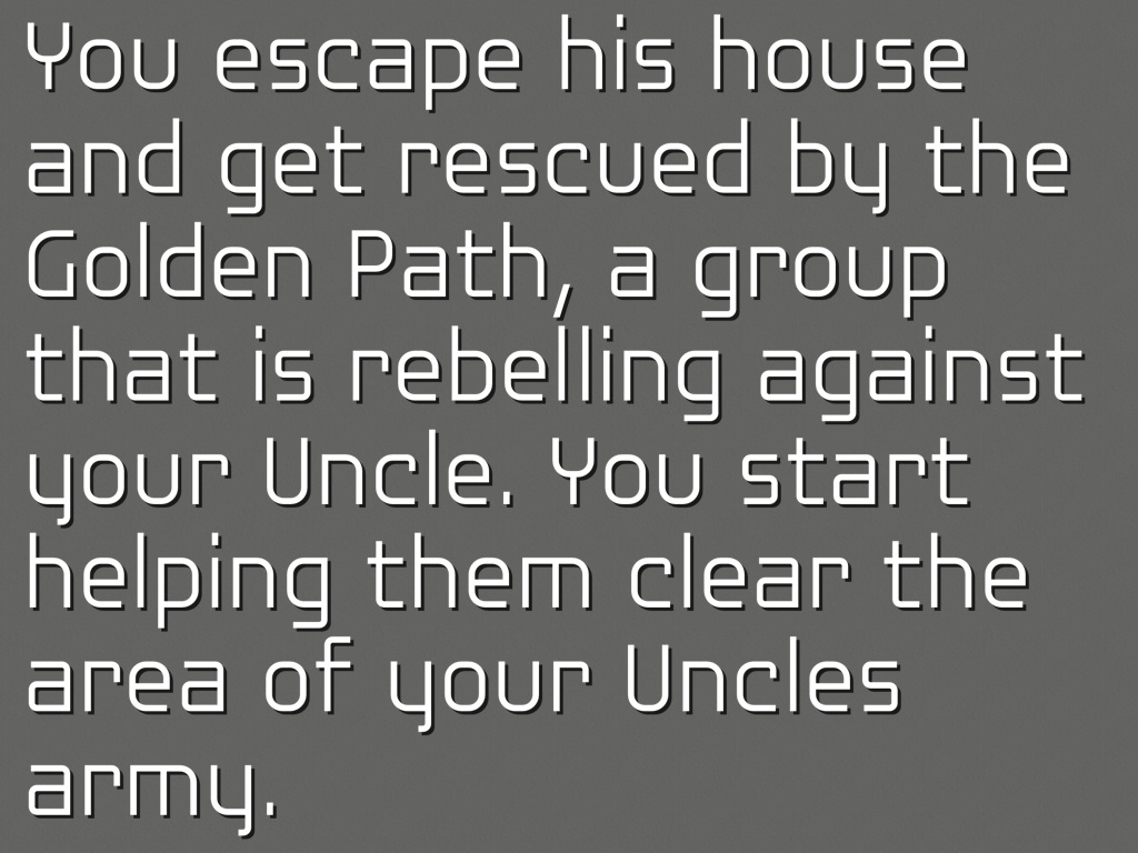 You escape his house and get rescued by the Golden Path, a group that is rebelling against your Uncle. You start helping them clear the area of your Uncles army.