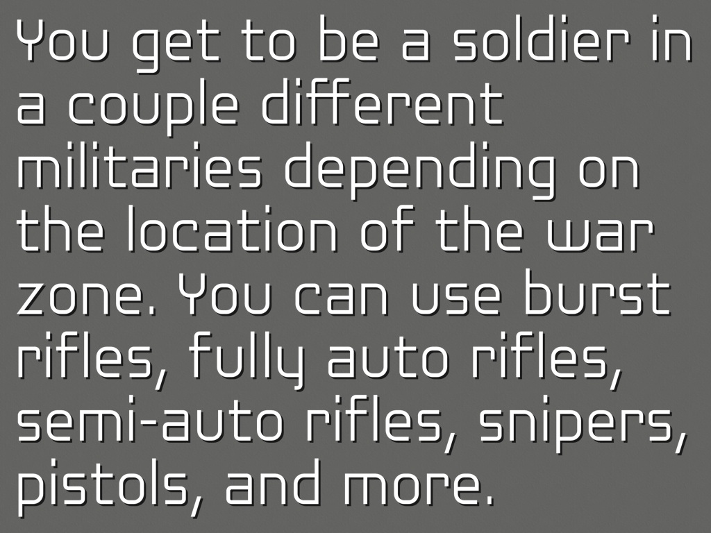 You get to be a soldier in a couple different militaries depending on the location of the war zone. You can use burst rifles, fully auto rifles, semi-auto rifles, snipers, pistols, and more.