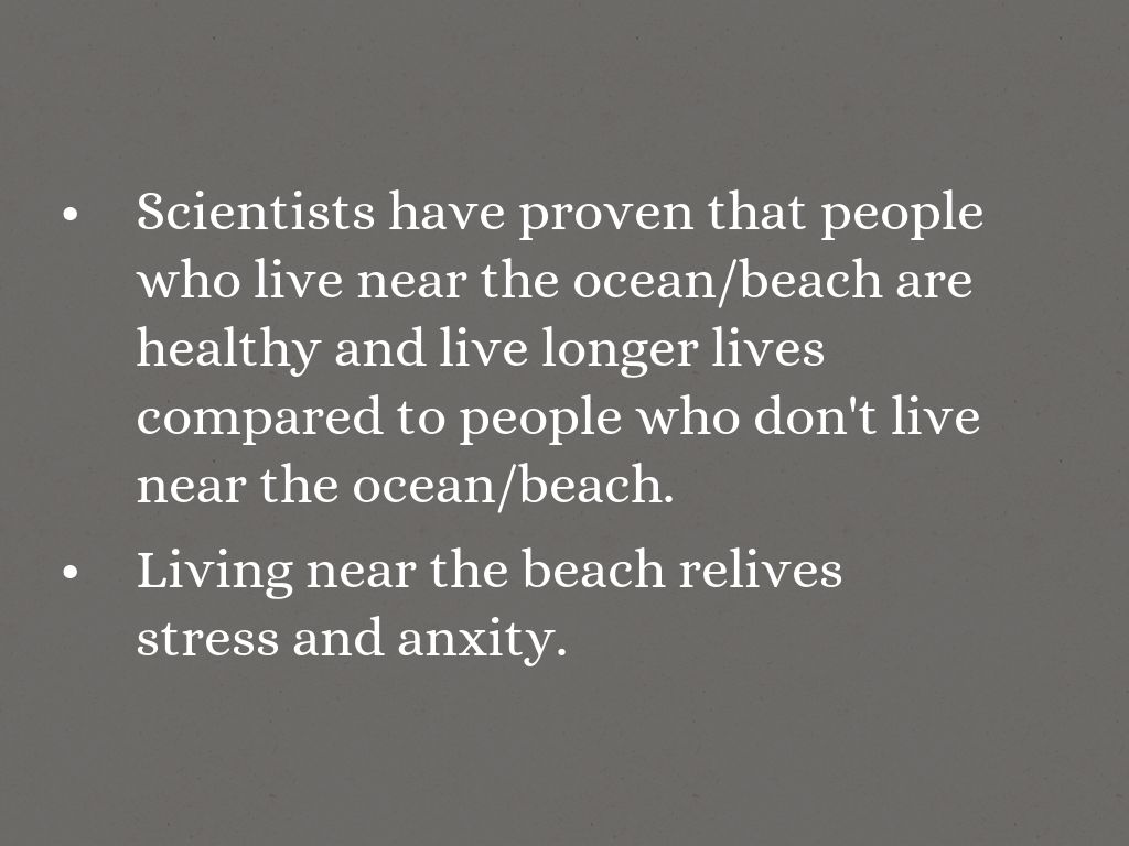 Scientists have proven that people who live near the ocean/beach are healthy and live longer lives compared to people who don't live near the ocean/beach.