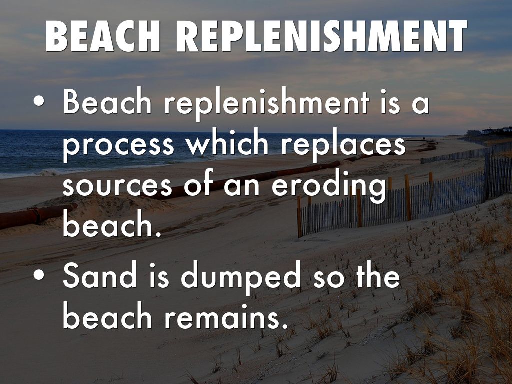 Beach replenishment is a process which replaces sources of an eroding beach.