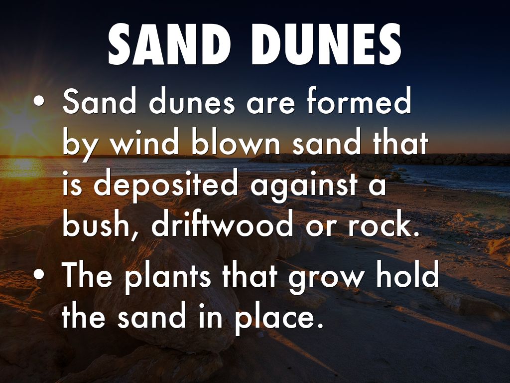 Sand dunes are formed by wind blown sand that is deposited against a bush, driftwood or rock.