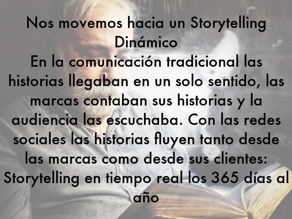 Nos movemos hacia un Storytelling Dinámico En la comunicación tradicional las historias llegaban en un solo sentido, las marcas contaban sus historias y la audiencia las escuchaba. Con las redes sociales las historias fluyen tanto desde las marcas como desde sus clientes: Storytelling en tiempo real los 365 días al año