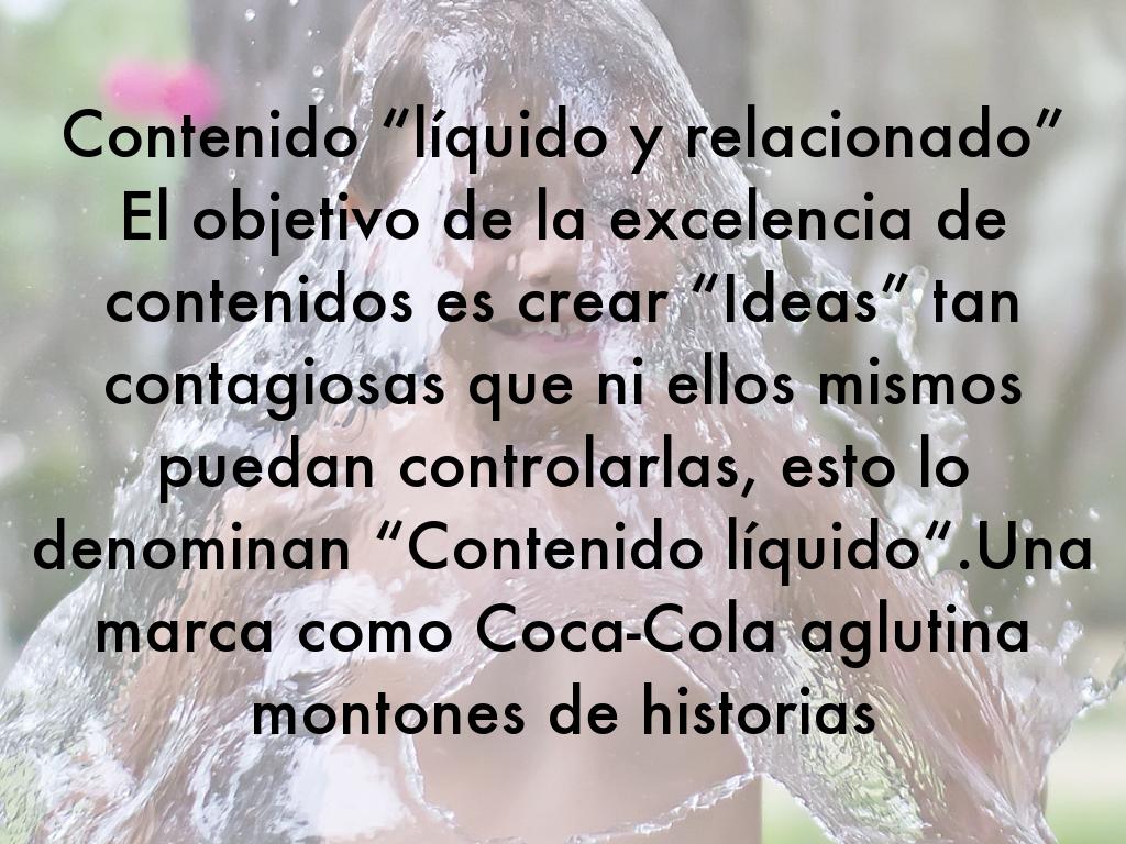 Contenido “líquido y relacionado” El objetivo de la excelencia de contenidos es crear “Ideas” tan contagiosas que ni ellos mismos puedan controlarlas, esto lo denominan “Contenido líquido“.Una marca como Coca-Cola aglutina montones de historias