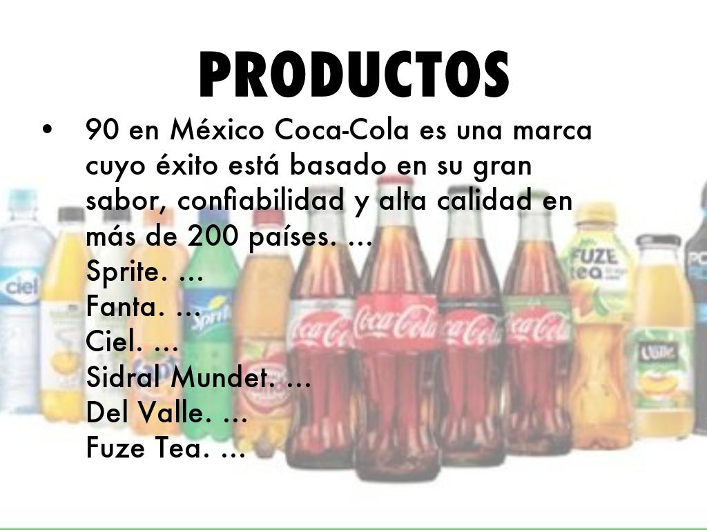 90 en México Coca-Cola es una marca cuyo éxito está basado en su gran sabor, confiabilidad y alta calidad en más de 200 países. ...