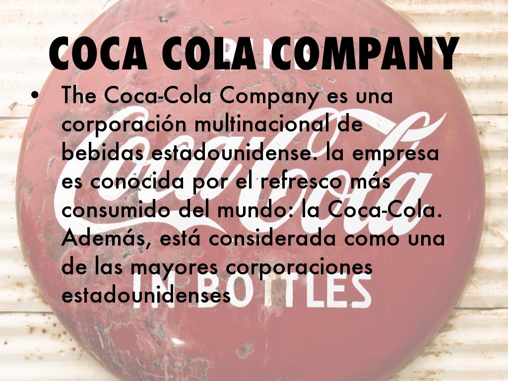 The Coca-Cola Company es una corporación multinacional de bebidas estadounidense. la empresa es conocida por el refresco más consumido del mundo: la Coca-Cola. Además, está considerada como una de las mayores corporaciones estadounidenses