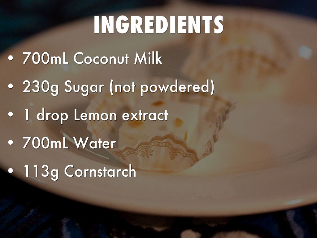 It should be frozen coconut milk that is defrosted. Lemon extract can be subsituted for 2 drops of lemon juice.
