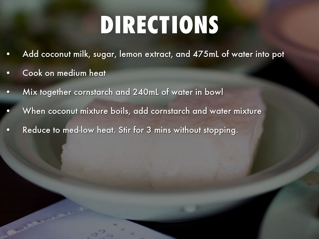 • Add coconut milk, sugar, lemon extract, and 475mL of water into pot