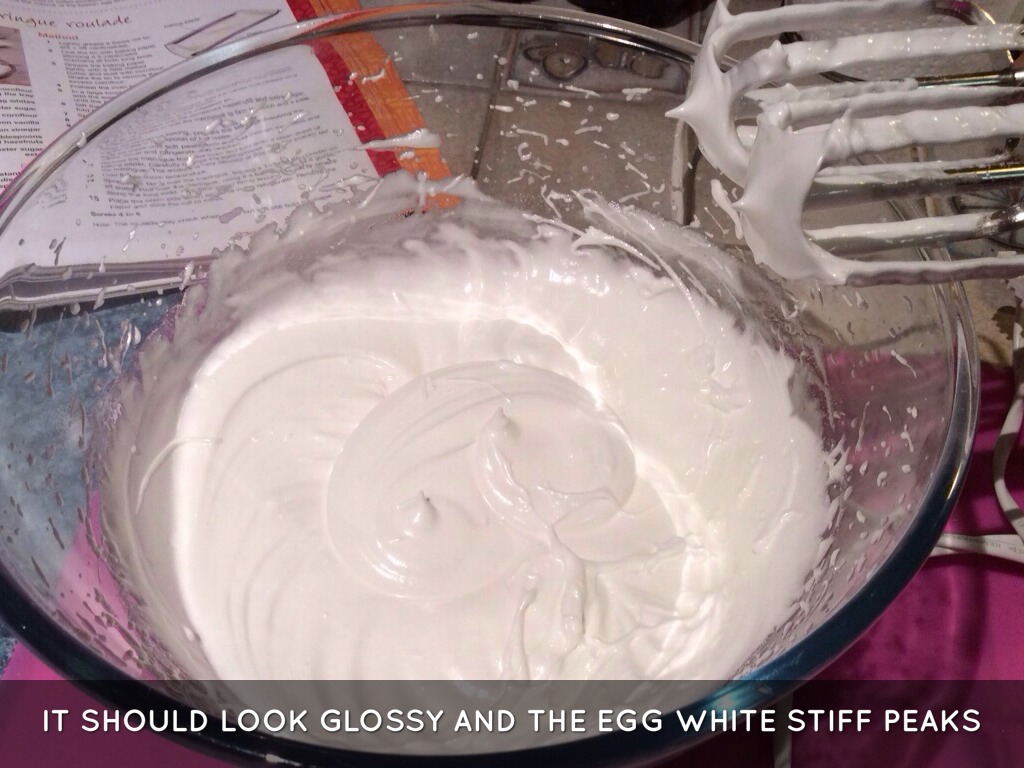 IT SHOULD LOOK GLOSSY AND THE EGG WHITE STIFF PEAKS