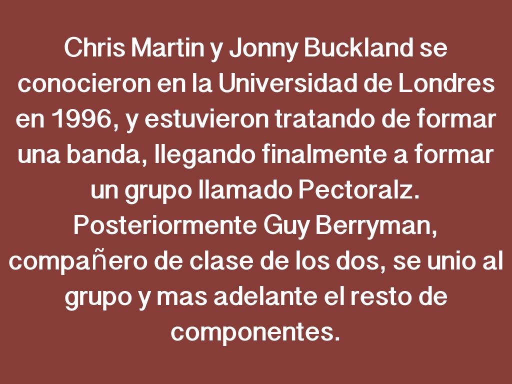 Chris Martin y Jonny Buckland se conocieron en la Universidad de Londres en 1996, y estuvieron tratando de formar una banda, llegando finalmente a formar un grupo llamado Pectoralz. Posteriormente Guy Berryman, compañero de clase de los dos, se unio al grupo y mas adelante el resto de componentes.