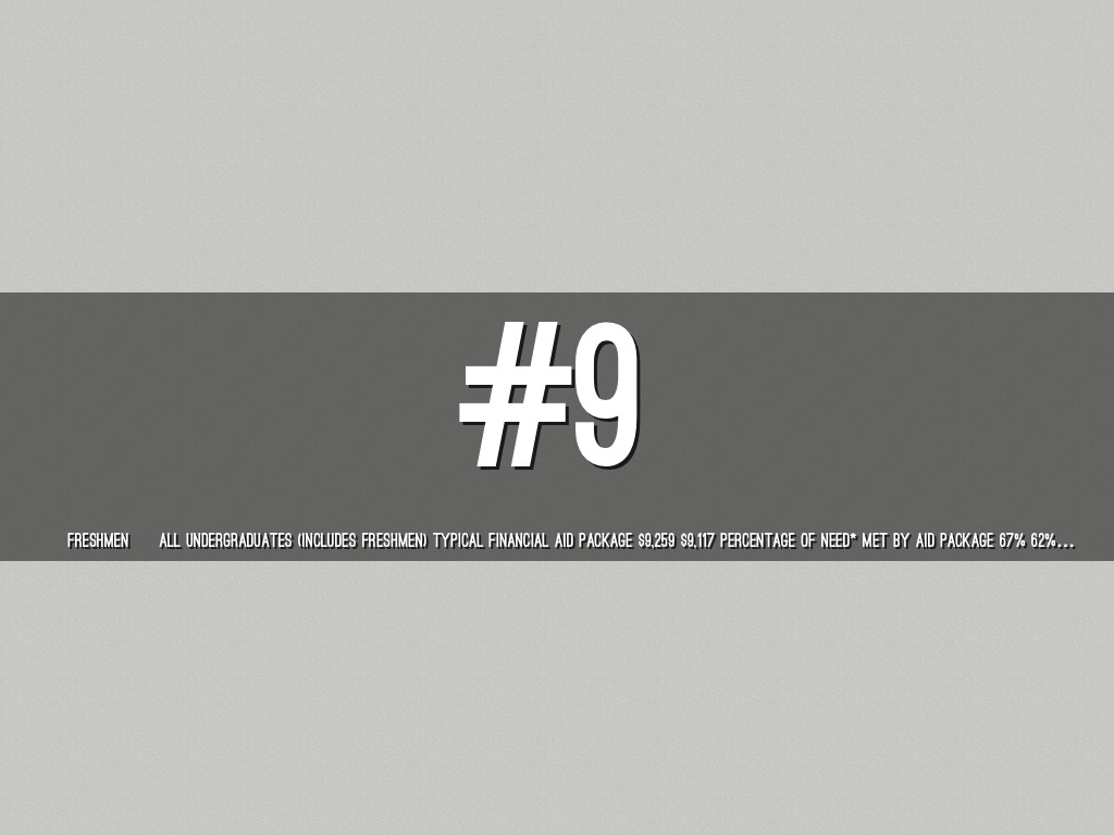 Freshmen All undergraduates (includes freshmen) Typical financial aid package $9,259 $9,117 Percentage of need* met by aid package 67% 62% Average amount of financial aid awarded Loan $2,940 $4,173 Scholarship or grant $4,660 $4,743 * "Need" as defined for financial aid results from a formula based on a student's situation. The formula considers family and student income, family size, unusual expenses, and the school's costs. Who received financial aid Freshmen All undergraduates (includes freshmen) Number who applied for financial aid 1,214 5,537 Number who received financial aid 757 3,921 Loans Percentage of students who took out loans to pay for school 47% Average student loan debt for last graduating class $21,241 Financial aid programs at this school Loans Federal Perkins loans Federal PLUS loans (for parents) Federal Stafford loans (subsidized) Federal Stafford loans (unsubsidized) Need-based scholarships and grants Federal Pell Grants Federal Supplemental Education Opportunity Grant (FSEOG) Privately-sponsored scholarships and grants School-sponsored scholarships and grants State-sponsored scholarships and grants Merit-based scholarships and grants School-sponsored scholarships in academics School-sponsored scholarships in art School-sponsored scholarships in special achievements School-sponsored scholarships for special characteristics Student employment Work study