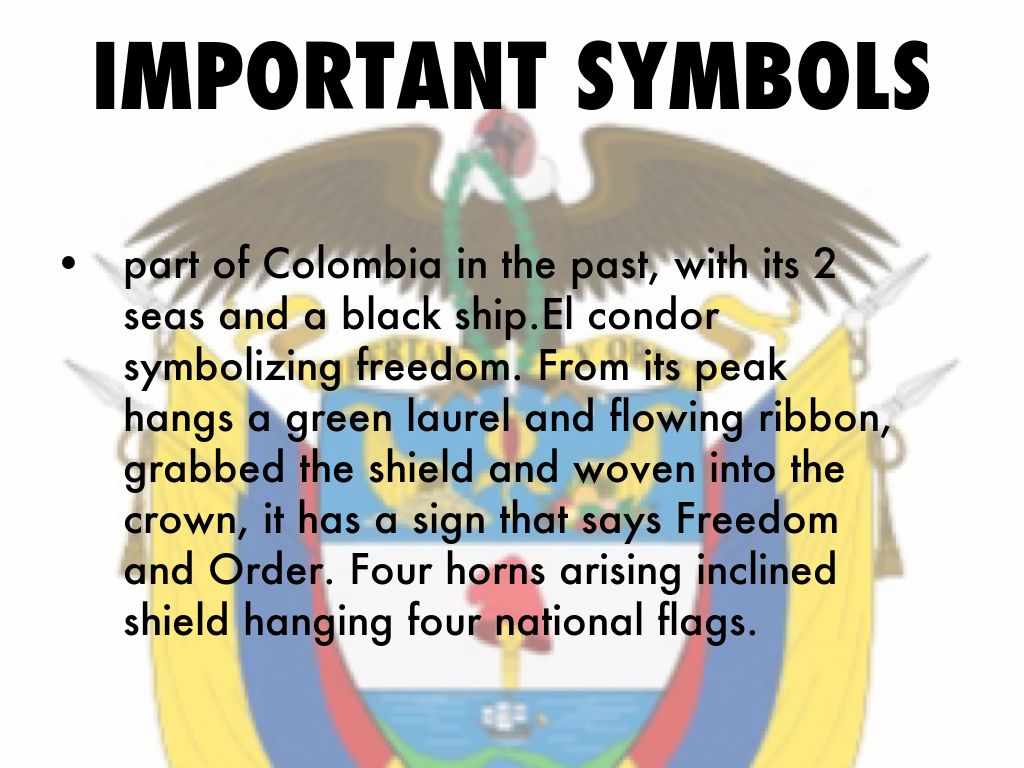 part of Colombia in the past, with its 2 seas and a black ship.El condor symbolizing freedom. From its peak hangs a green laurel and flowing ribbon, grabbed the shield and woven into the crown, it has a sign that says Freedom and Order. Four horns arising inclined shield hanging four national flags.