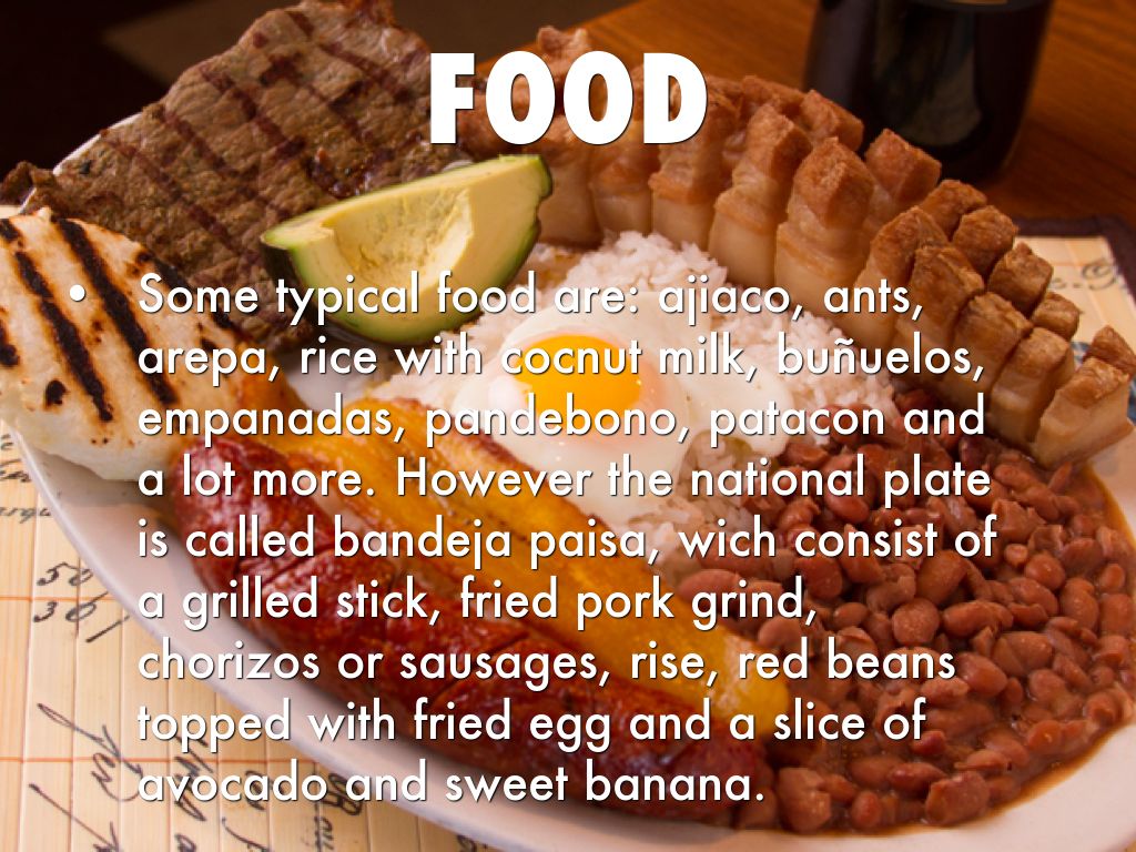Some typical food are: ajiaco, ants, arepa, rice with cocnut milk, buñuelos, empanadas, pandebono, patacon and a lot more. However the national plate is called bandeja paisa, wich consist of a grilled stick, fried pork grind, chorizos or sausages, rise, red beans topped with fried egg and a slice of avocado and sweet banana.