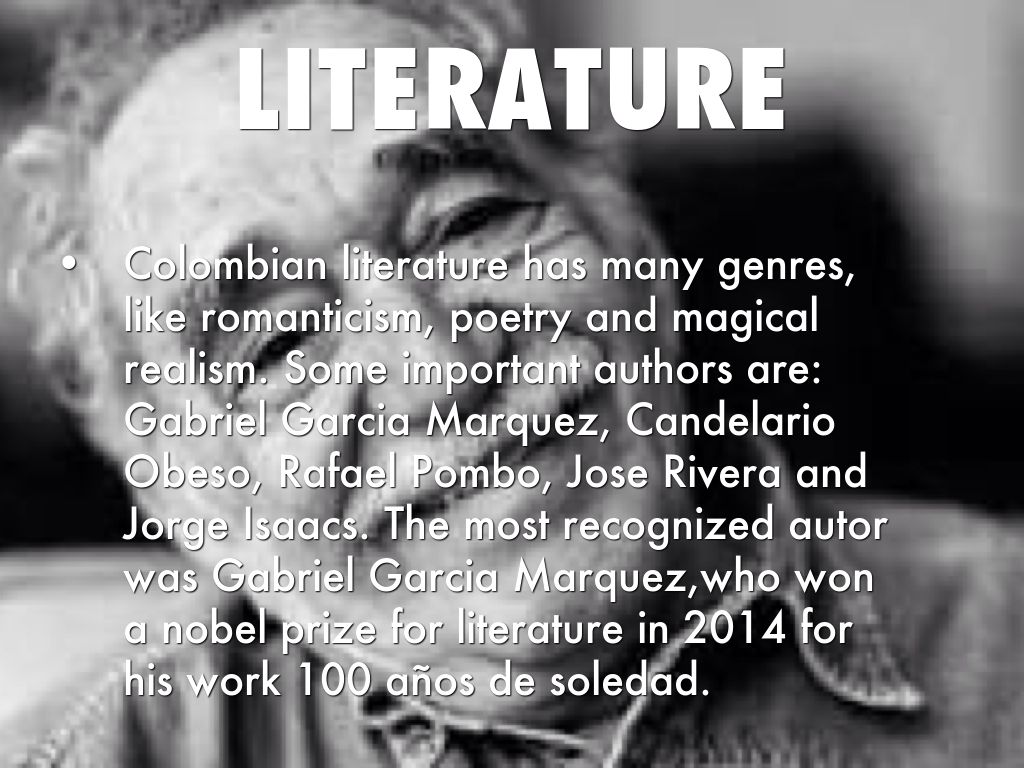 Colombian literature has many genres, like romanticism, poetry and magical realism. Some important authors are: Gabriel Garcia Marquez, Candelario Obeso, Rafael Pombo, Jose Rivera and Jorge Isaacs. The most recognized autor was Gabriel Garcia Marquez,who won a nobel prize for literature in 2014 for his work 100 años de soledad.