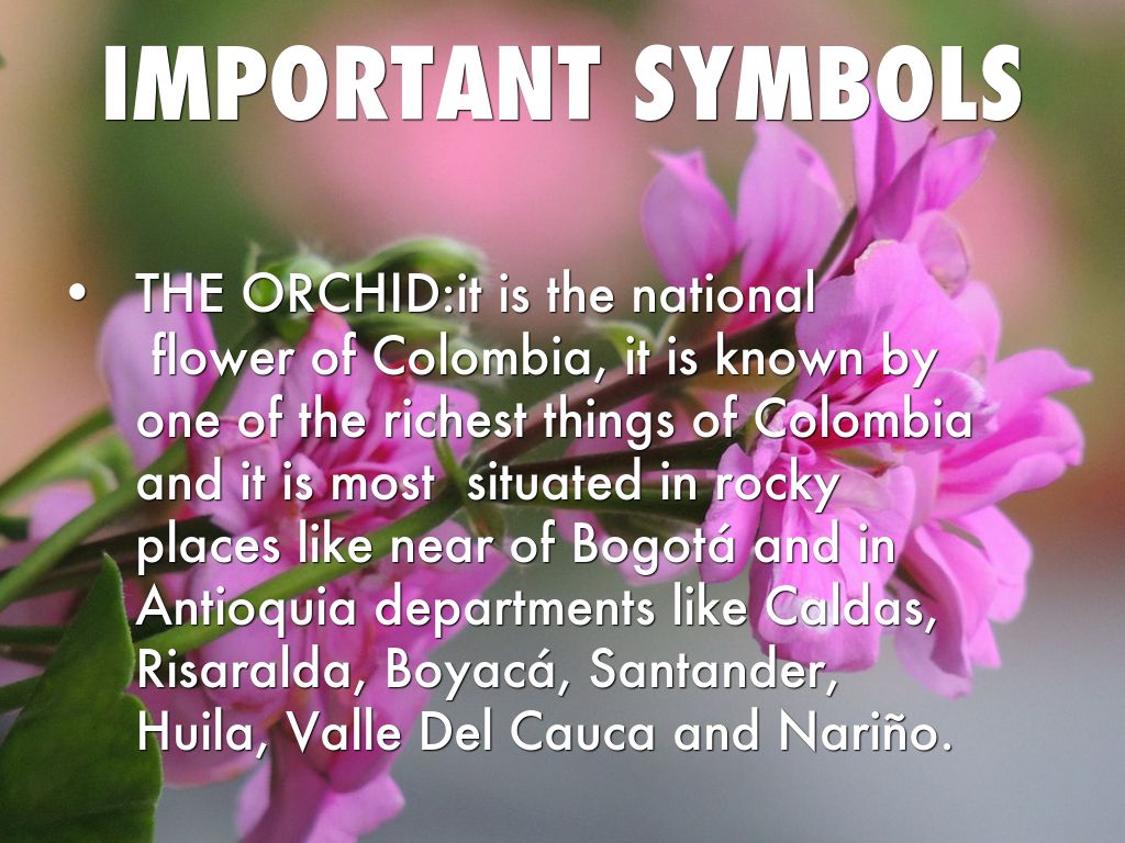 THE ORCHID:it is the national flower of Colombia, it is known by one of the richest things of Colombia and it is most situated in rocky places like near of Bogotá and in Antioquia departments like Caldas, Risaralda, Boyacá, Santander, Huila, Valle Del Cauca and Nariño.