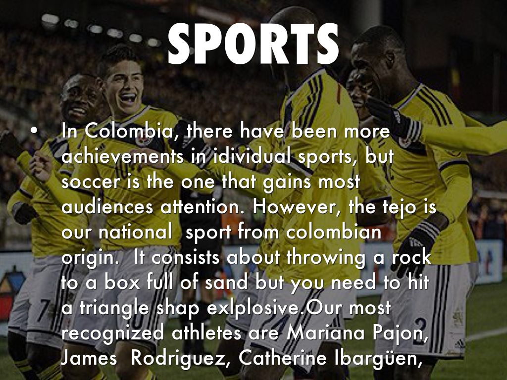In Colombia, there have been more achievements in idividual sports, but soccer is the one that gains most audiences attention. However, the tejo is our national sport from colombian origin. It consists about throwing a rock to a box full of sand but you need to hit a triangle shap exlplosive.Our most recognized athletes are Mariana Pajon, James Rodriguez, Catherine Ibargüen, Falcao Garcia, Nairo Quintana and more.