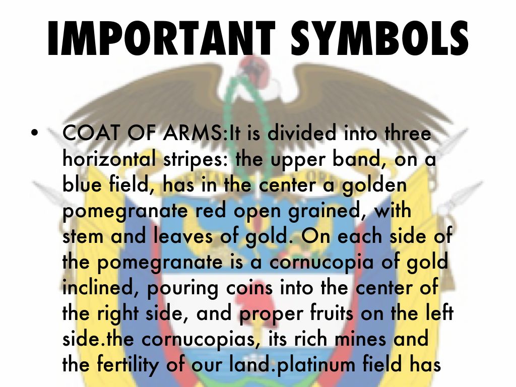 COAT OF ARMS:It is divided into three horizontal stripes: the upper band, on a blue field, has in the center a golden pomegranate red open grained, with stem and leaves of gold. On each side of the pomegranate is a cornucopia of gold inclined, pouring coins into the center of the right side, and proper fruits on the left side.the cornucopias, its rich mines and the fertility of our land.platinum field has in its center a Phrygian cap into a spear, a symbol of freedom. At the lower end is Panama that was