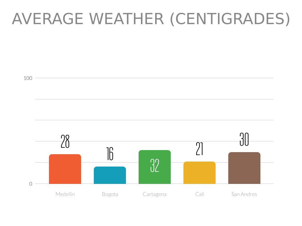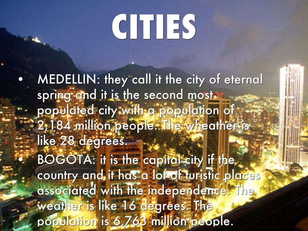 BOGOTA: it is the capital city if the country and it has a lot of turistic places associated with the independence. The weather is like 16 degrees. The population is 6,763 million people.