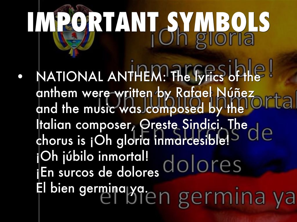 NATIONAL ANTHEM: The lyrics of the anthem were written by Rafael Núñez and the music was composed by the Italian composer, Oreste Sindici. The chorus is ¡Oh gloria inmarcesible!