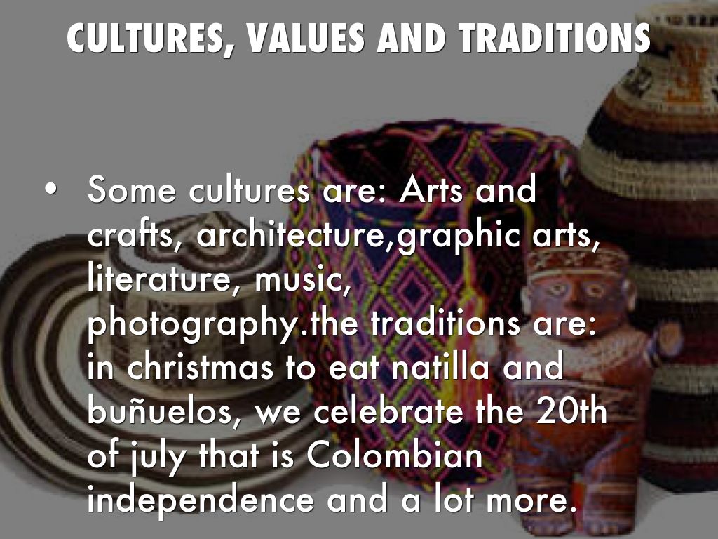 Some cultures are: Arts and crafts, architecture,graphic arts, literature, music, photography.the traditions are: in christmas to eat natilla and buñuelos, we celebrate the 20th of july that is Colombian independence and a lot more.
