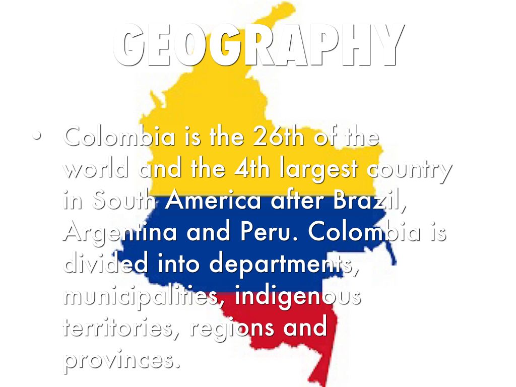 Colombia is the 26th of the world and the 4th largest country in South America after Brazil, Argentina and Peru. Colombia is divided into departments, municipalities, indigenous territories, regions and provinces.