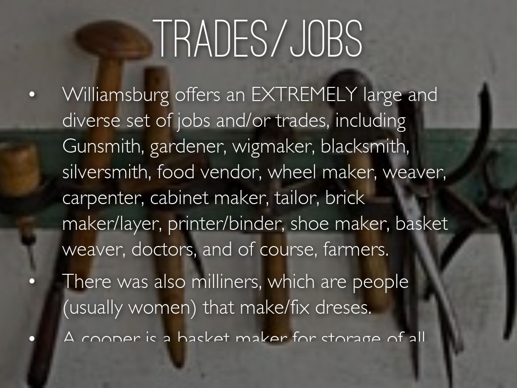 Williamsburg offers an EXTREMELY large and diverse set of jobs and/or trades, including Gunsmith, gardener, wigmaker, blacksmith, silversmith, food vendor, wheel maker, weaver, carpenter, cabinet maker, tailor, brick maker/layer, printer/binder, shoe maker, basket weaver, doctors, and of course, farmers.