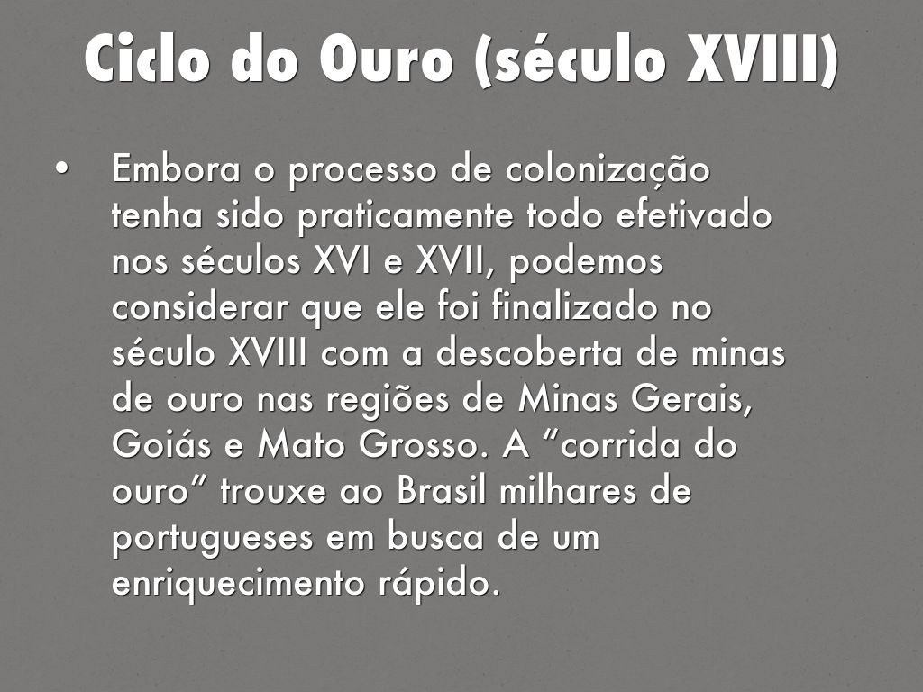 Embora o processo de colonização tenha sido praticamente todo efetivado nos séculos XVI e XVII, podemos considerar que ele foi finalizado no século XVIII com a descoberta de minas de ouro nas regiões de Minas Gerais, Goiás e Mato Grosso. A “corrida do ouro” trouxe ao Brasil milhares de portugueses em busca de um enriquecimento rápido.