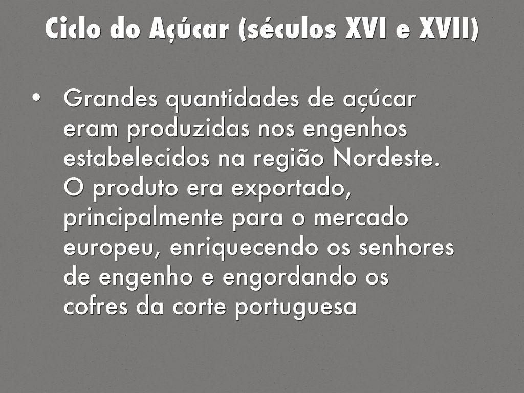 Grandes quantidades de açúcar eram produzidas nos engenhos estabelecidos na região Nordeste. O produto era exportado, principalmente para o mercado europeu, enriquecendo os senhores de engenho e engordando os cofres da corte portuguesa