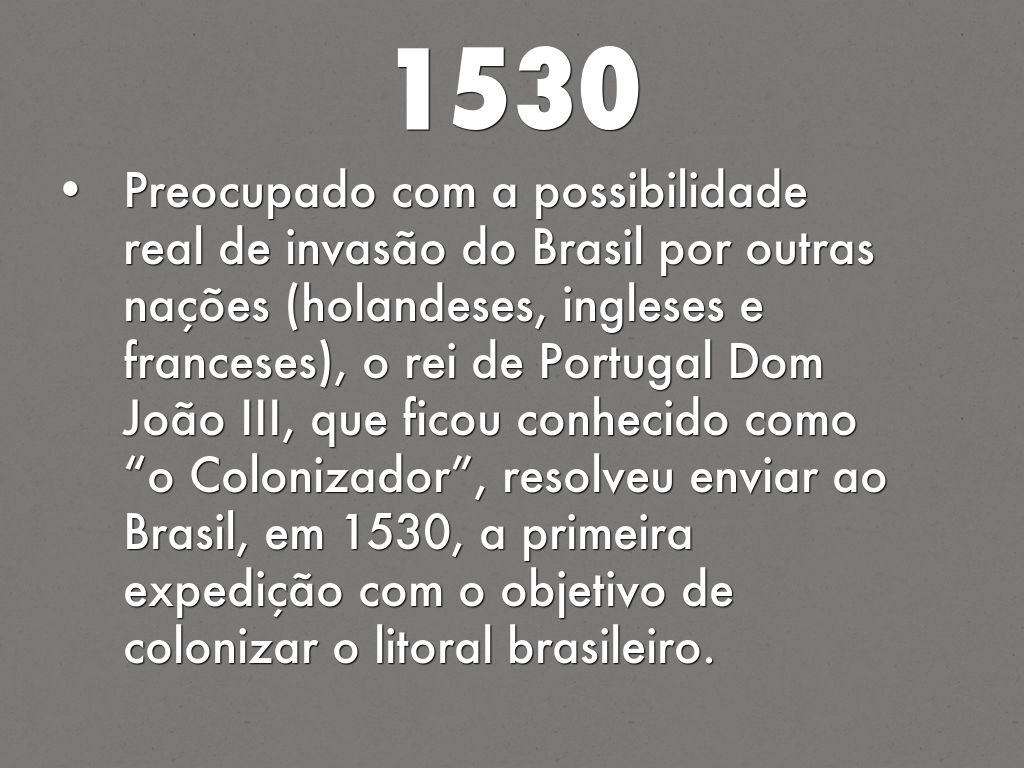 Preocupado com a possibilidade real de invasão do Brasil por outras nações (holandeses, ingleses e franceses), o rei de Portugal Dom João III, que ficou conhecido como “o Colonizador”, resolveu enviar ao Brasil, em 1530, a primeira expedição com o objetivo de colonizar o litoral brasileiro.