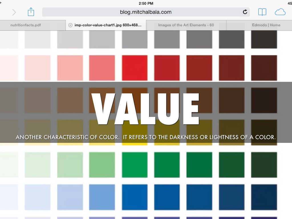 another characteristic of color. It refers to the darkness or lightness of a color.
