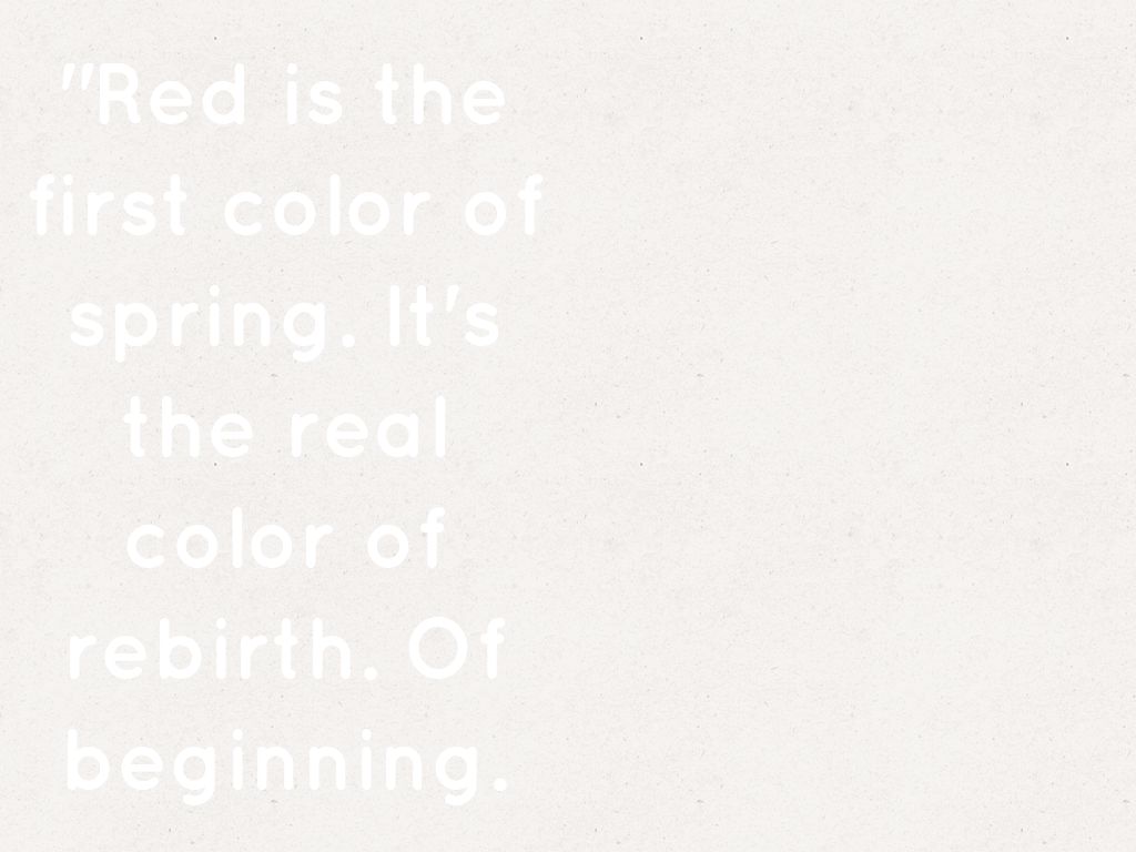 "Red is the first color of spring. It's the real color of rebirth. Of beginning.