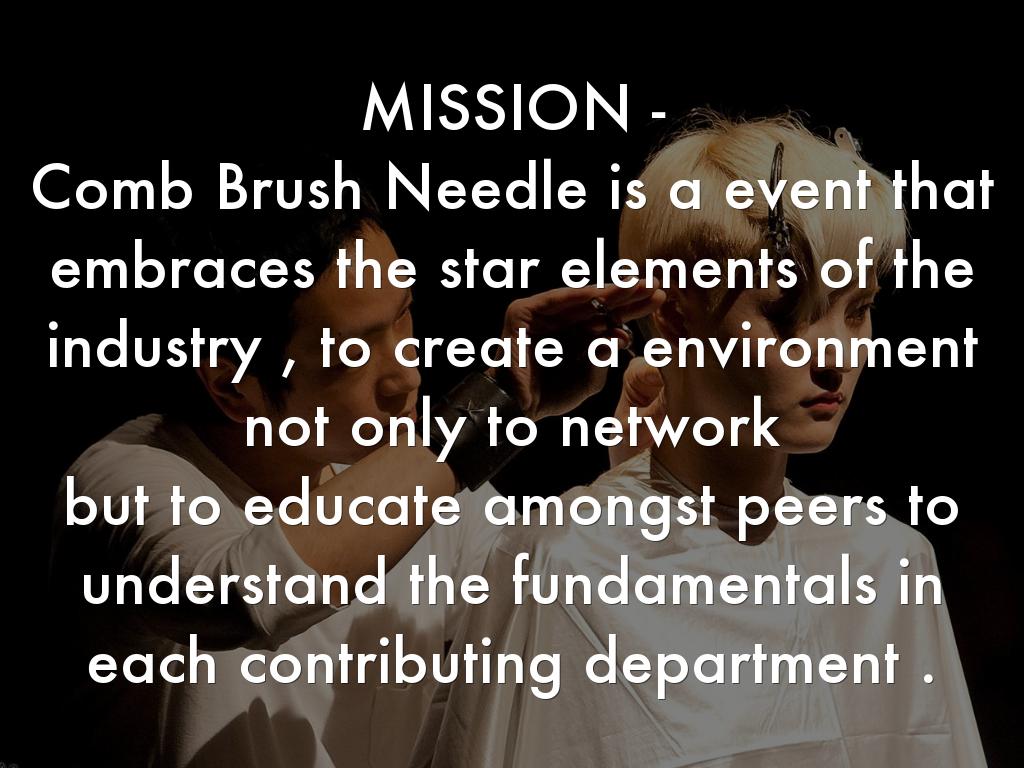 MISSION - Comb Brush Needle is a event that embraces the star elements of the industry , to create a enviroment not only to network but to educate amongst peers to understand the fundamentals in each contributing department .
