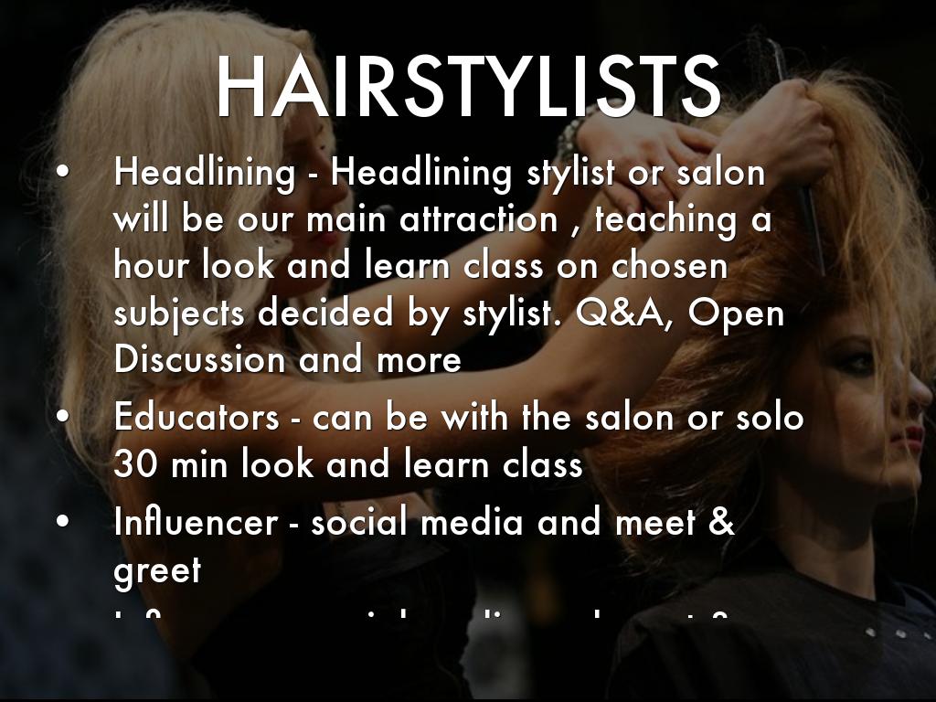 • Headlining - Headlining stylist or salon will be our main attraction , teaching a hour look and learn class on chosen subjects decided by stylist. Q&A, Open Discussion and more