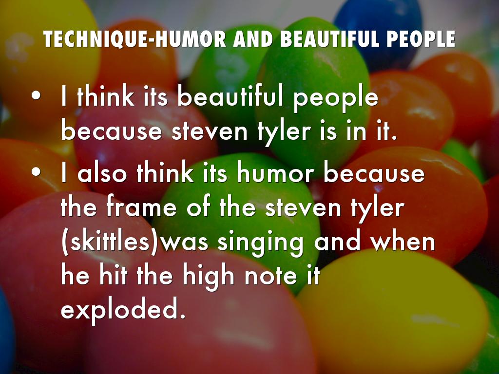 • I also think its humor because the frame of the steven tyler (skittles)was singing and when he hit the high note it exploded.