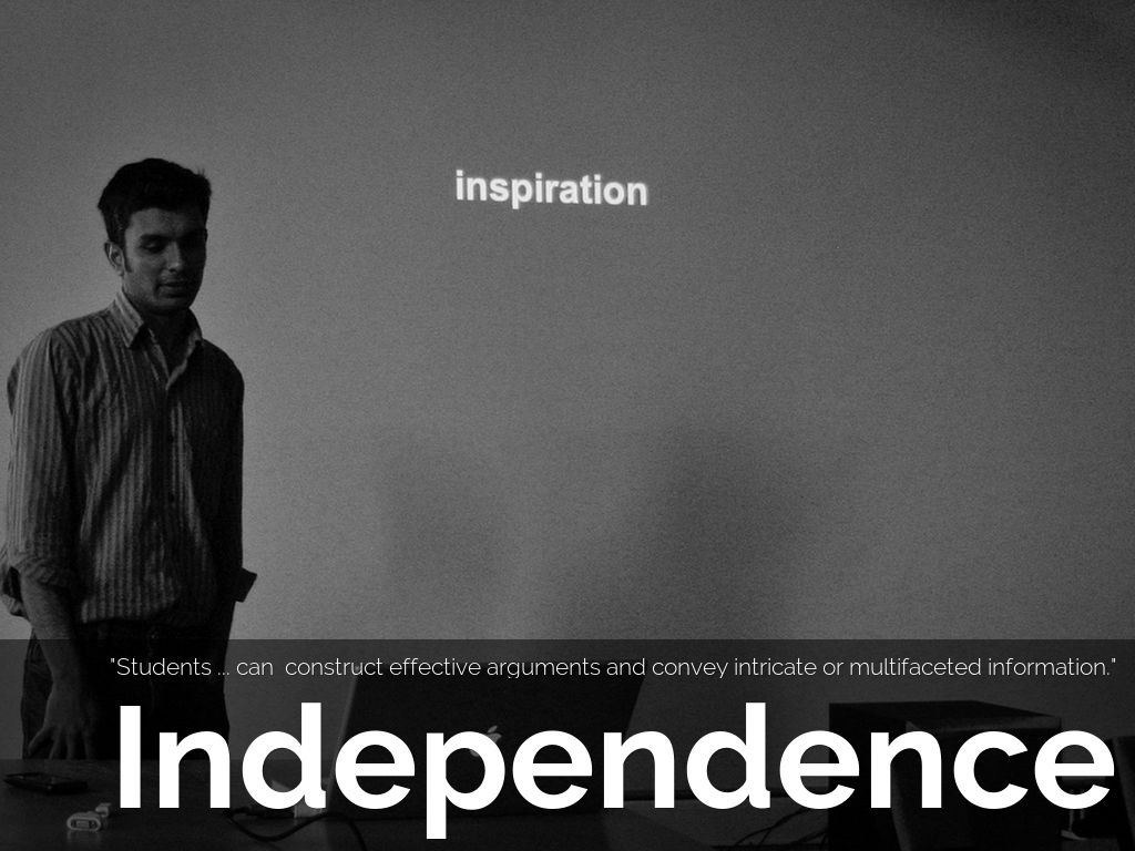 "Students can, without significant scaffolding, comprehend and evaluate complex texts across a range of types and disciplines, and they can construct effective arguments and convey intricate or multifaceted information. Likewise, students are able independently to discern a speaker’s key points, request clarification, and ask relevant questions. They build on others’ ideas, articulate their own ideas, and confirm they have been understood. Without prompting, they demonstrate command of standard English and acquire and use a wide-ranging vocabulary. More broadly, they become self-directed learners, effectively seeking out and using resources to assist them, including teachers, peers, and print and digital reference materials."