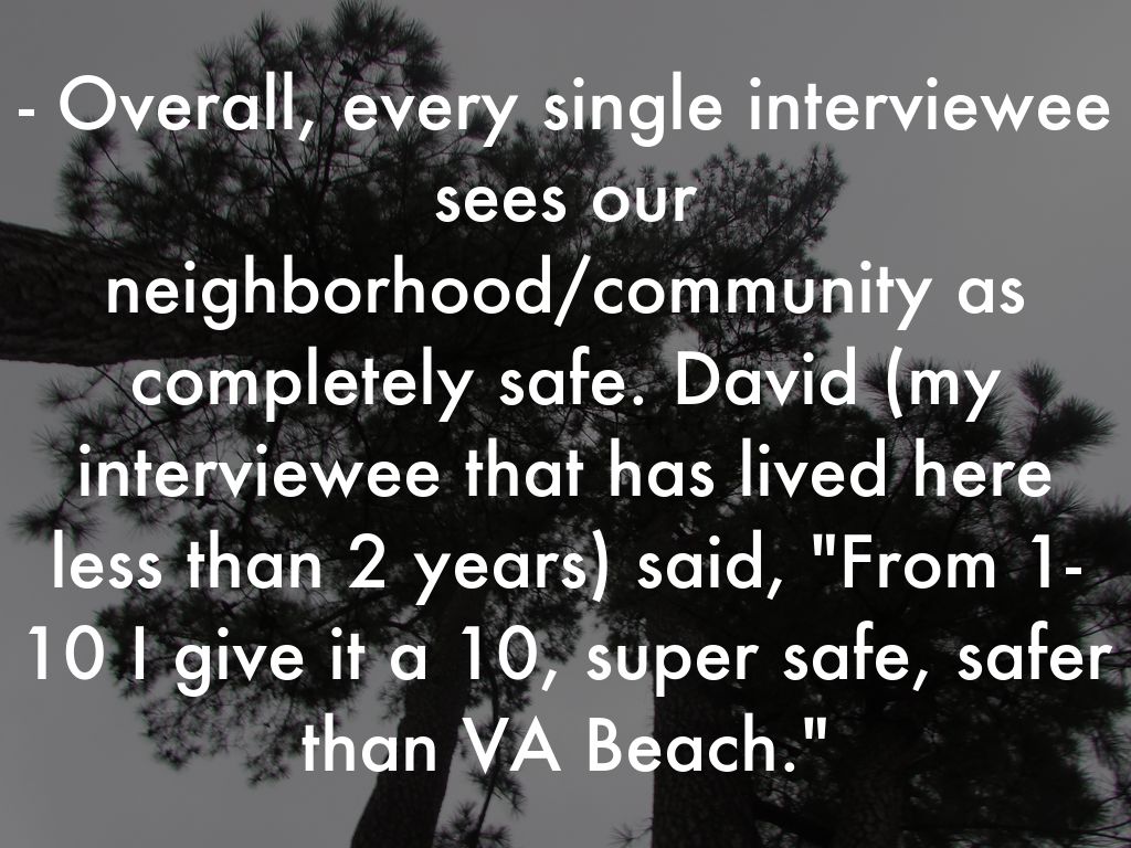 - Overall, every single interviewee sees our neighborhood/community as completely safe. David (my interviewee that has lived here less than 2 years) said, "From 1-10 I give it a 10, super safe, safer than VA Beach."