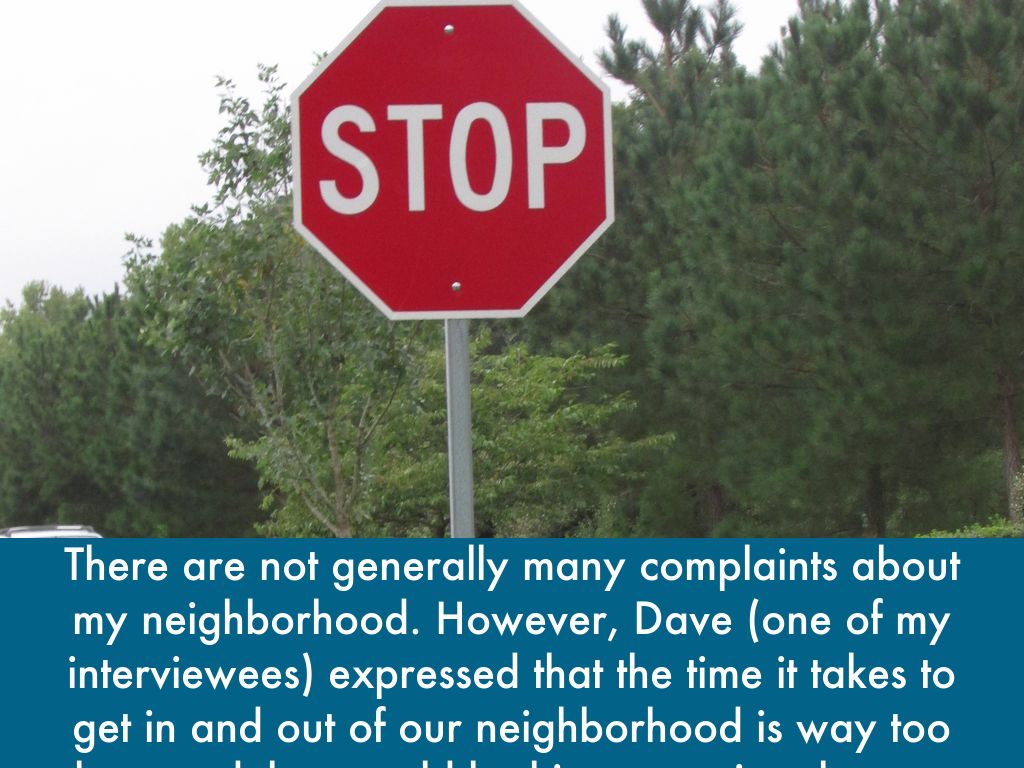 There are not generally many complaints about my neighborhood. However, Dave (one of my interviewees) expressed that the time it takes to get in and out of our neighborhood is way too long and that would be his one major change.