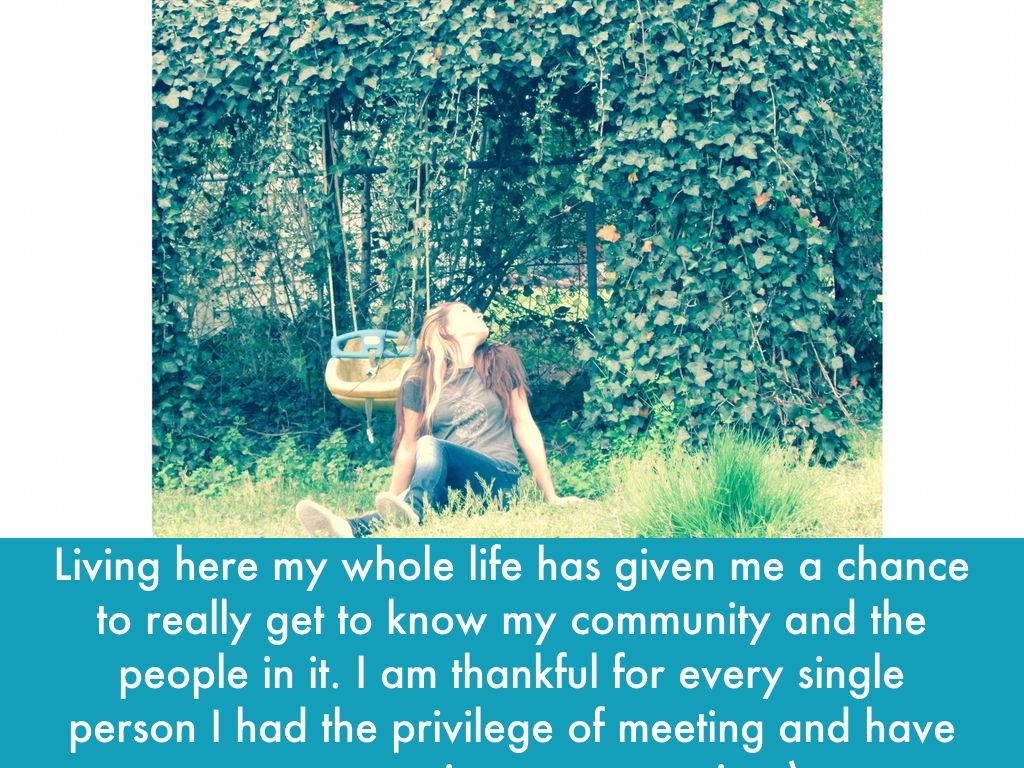 Living here my whole life has given me a chance to really get to know my community and the people in it. I am thankful for every single person I had the privilege of meeting and have yet to meet in my community :)