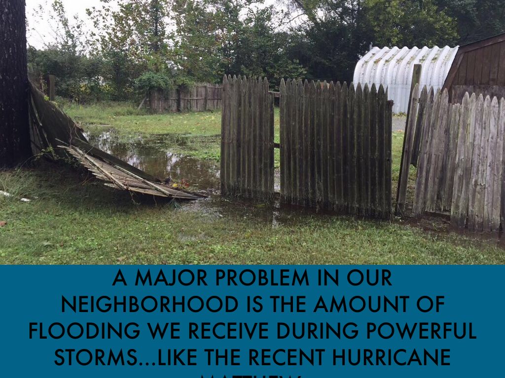 A MAJOR PROBLEM IN OUR NEIGHBORHOOD IS THE AMOUNT OF FLOODING WE RECEIVE DURING POWERFUL STORMS...LIKE THE RECENT HURRICANE MATTHEW.