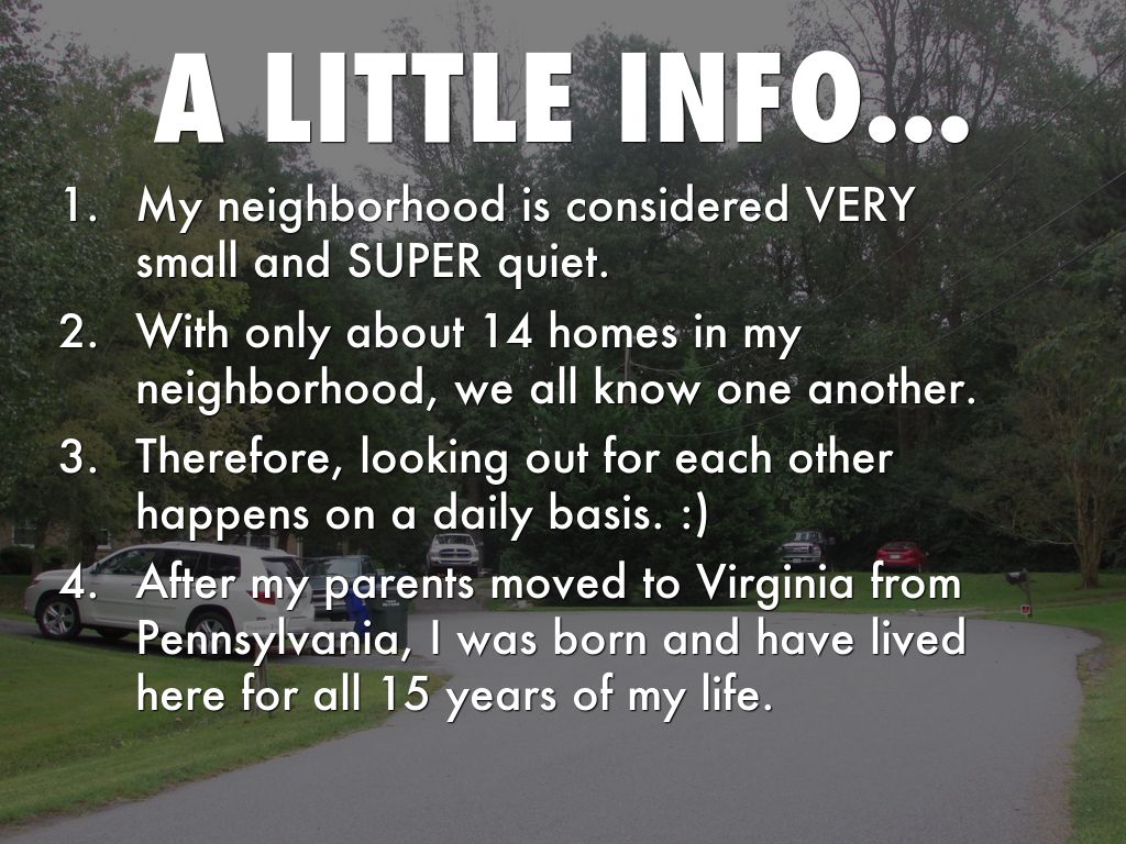 - After my parents moved to Virginia from Pennsylvania, I was born and have lived here for all 15 years of my life.