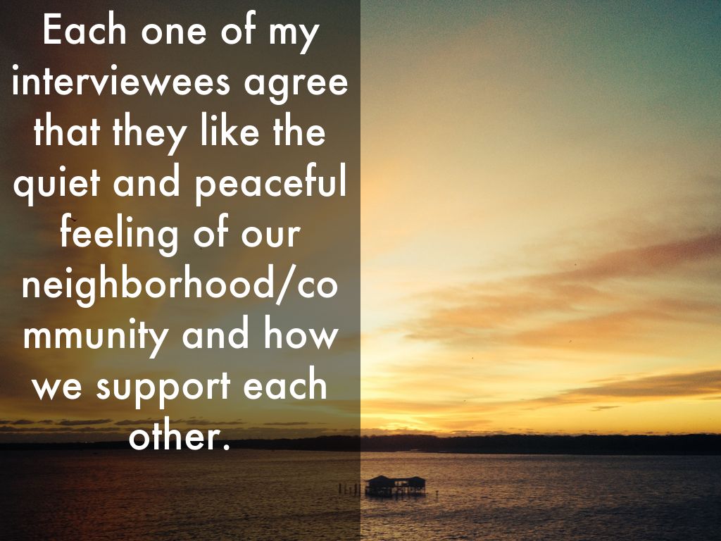Each one of my interviewees agree that they like the quiet and peaceful feeling of our neighborhood/community and how we support each other.