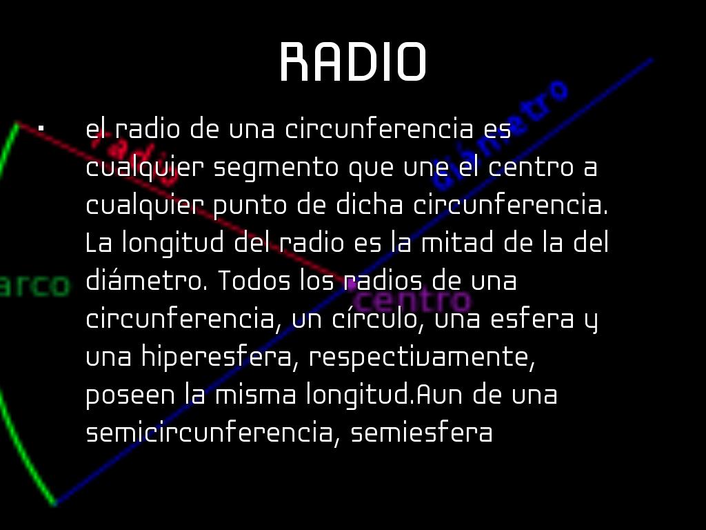 el radio de una circunferencia es cualquier segmento que une el centro a cualquier punto de dicha circunferencia. La longitud del radio es la mitad de la del diámetro. Todos los radios de una circunferencia, un círculo, una esfera y una hiperesfera, respectivamente, poseen la misma longitud.Aun de una semicircunferencia, semiesfera