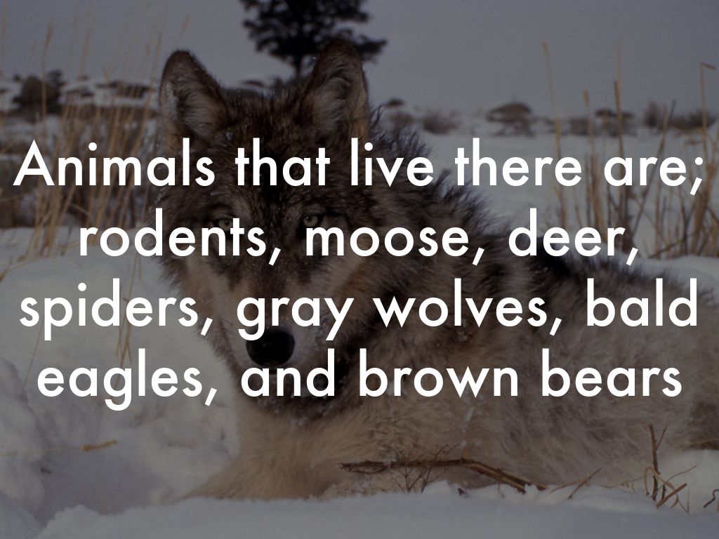 Animals that live there are; rodents, moose, deer, spiders, gray wolves, bald eagles, and brown bears