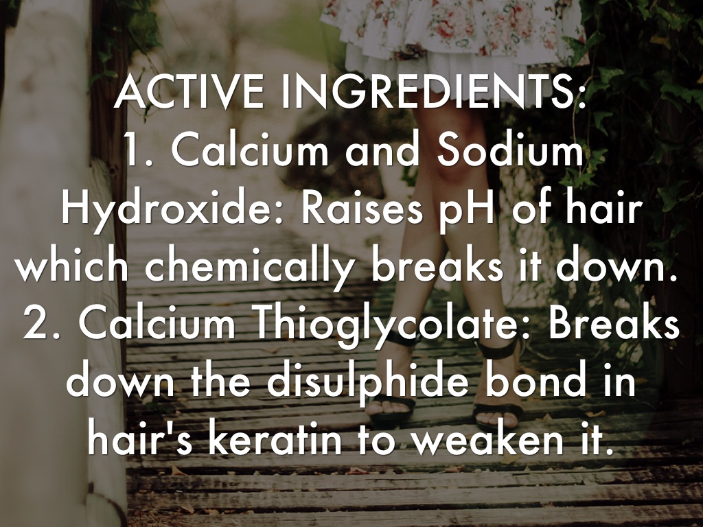 1. Calcium and Sodium Hydroxide: Raises pH of hair which chemically breaks it down.
