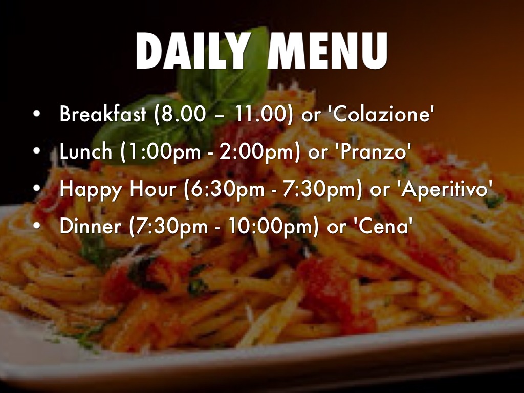 • Dinner (7:30pm - 10:00pm) or 'Cena'