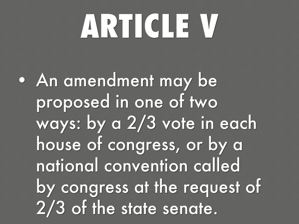 • An amendment may be proposed in one of two ways: by a 2/3 vote in each house of congress, or by a national convention called by congress at the request of 2/3 of the state senate.