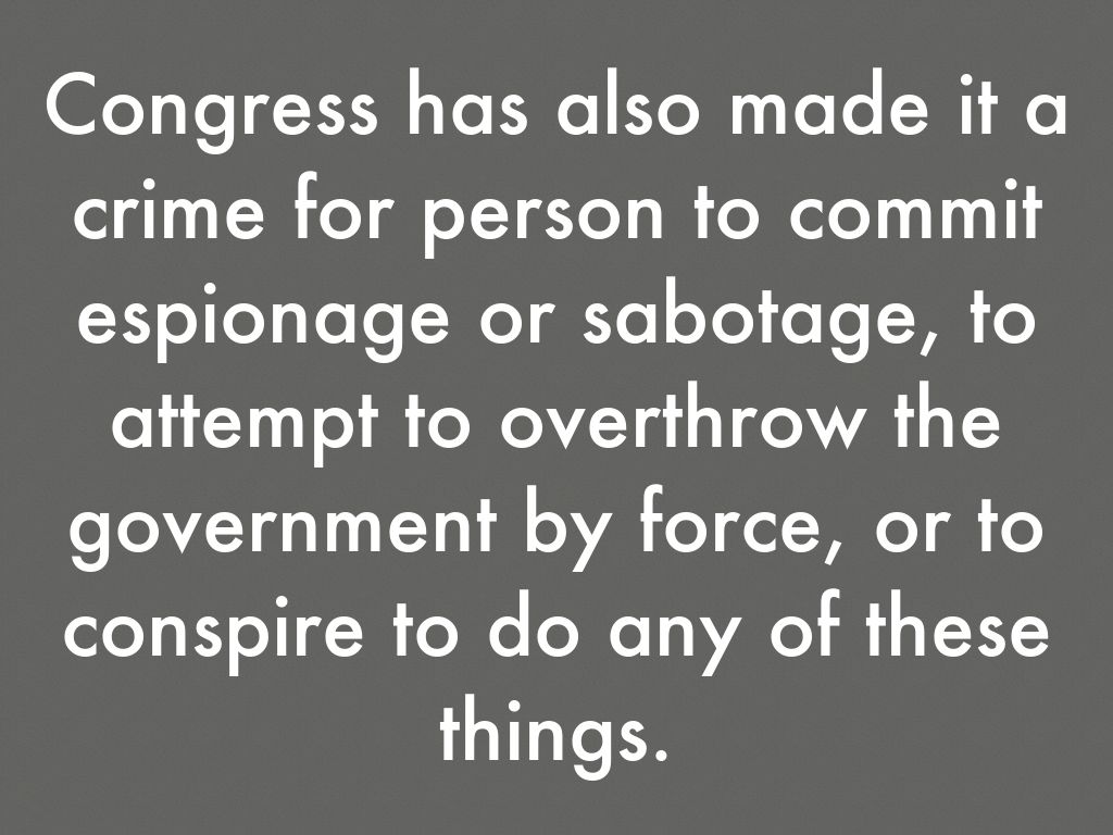 Congress has also made it a crime for person to commit espionage or sabotage, to attempt to overthrow the government by force, or to conspire to do any of these things.